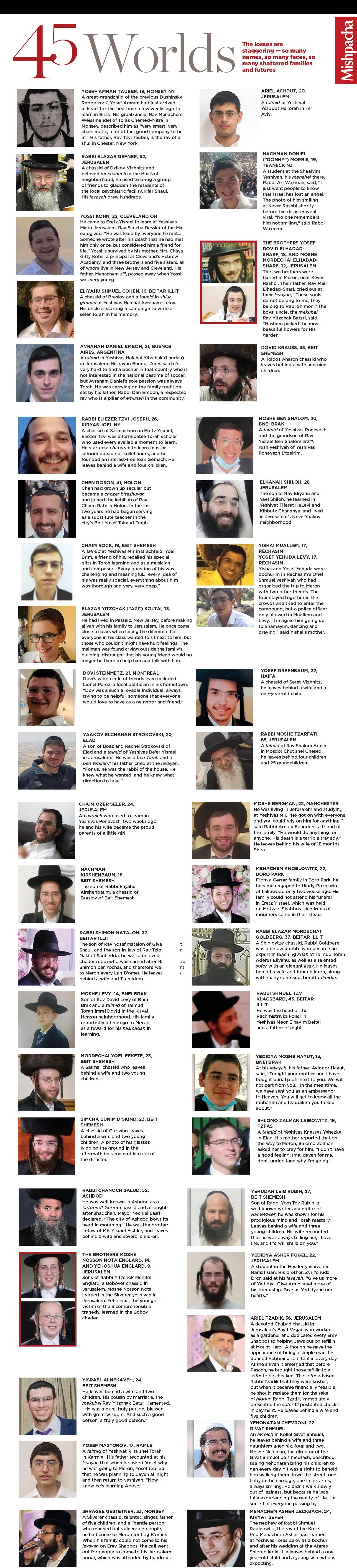 | In the Arms of Rabi Shimon | 45 Worlds By Mishpacha Contributors | May 4, 2021 (Originally featured in Mishpacha, Issue 859) [gravityform id="13" title="false" description="false" ajax="true"] RECOMMENDED | The Moment |Overheard: Issue 876Mishpacha Staff | The Moment |No WorriesMishpacha Staff | Counter Point |All Our Children: The conversation continuesMishpacha Readers | The Lens |The Lens: Issue 874Shuki Lehrer | The Moment |Words of the Eternal Brachah Hover Mishpacha Staff | Magazine Feature |The People Come First Yisroel Besser RELATED CONTENT Mishpacha ContributorsIn The Arms of Rabi Shimon Yisroel BesserWe’re Still Holding OnWe’re holding on, Tatteh. Listen to the hespedim, listen to the anguished voices as they praise You Rabbi Aharon DlinAvraham Daniel Embon, 21, Buenos AiresWhen Hashem decided to take Avraham Daniel, we lost a pure neshamah Bracha SteinTogether in Tears We are a nation in mourning, a nation united by what we’ve lost Rabbi Chaim Ozer GeldzahlerJust Hold the Pain When the pain is unbearable, we know that it’s only Hashem’s existence and mercy that can fill that void, that “makom” Rav Shraga KallusMoshe Bergman, 22, Manchester"Only now can I appreciate, when I reflect on the depth of my relationship with my talmid, the special connection of a rebbi to a talmid" + See all >