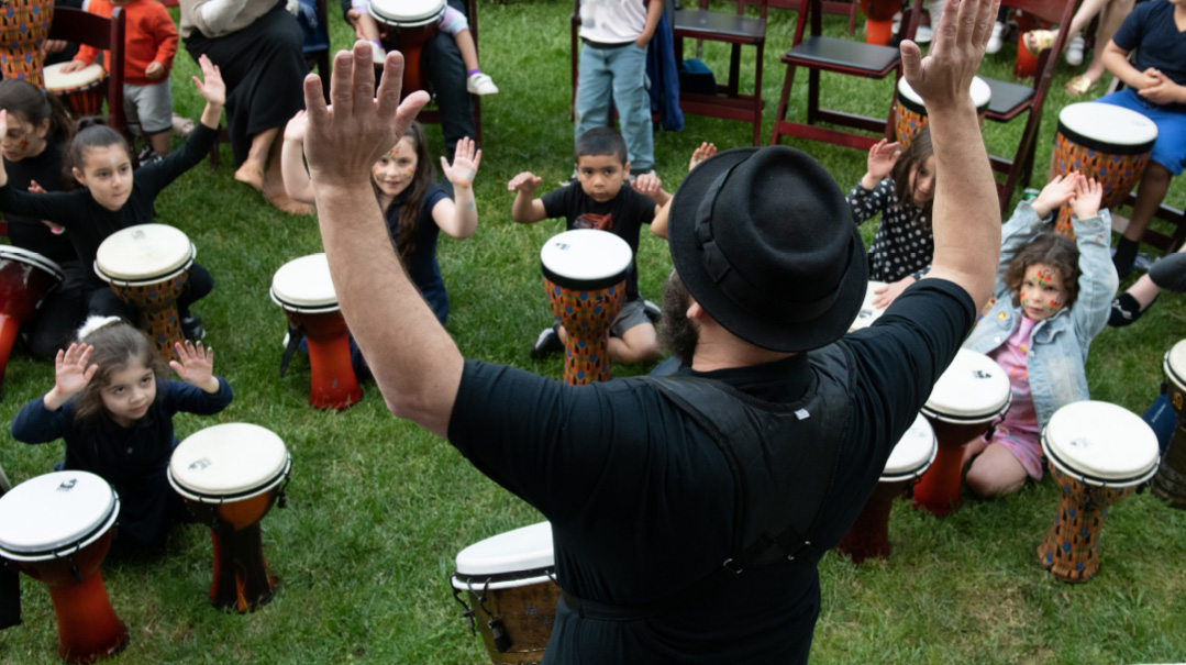 “Everybody take a drum!” Moshe says, gesturing to the collection of colorful djembe drums laid out on the grass. Djembe drums, which originated in West Africa, are popular worldwide because — like a darbouka — you can play them with your bare hands and they can achieve a range of pitches. Each drum is goblet-shaped with a leather-top surface, a wooden base, and vertical tuning ropes.