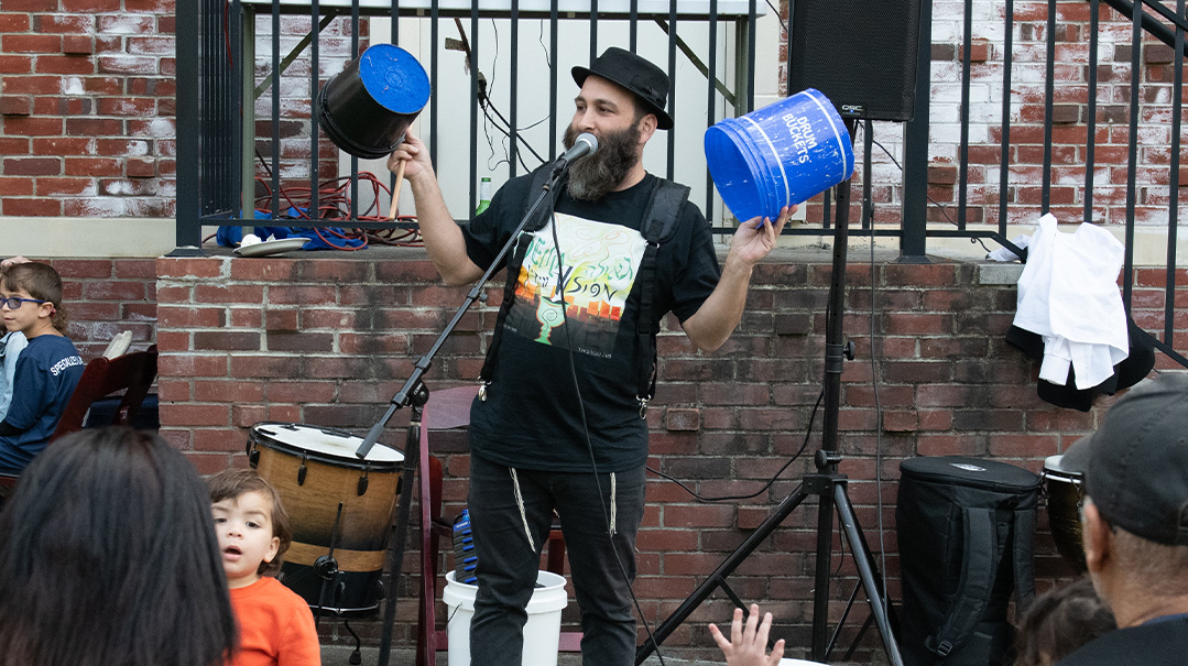 He begins by telling them a little about percussion, doing a brief show-and-tell of instruments including a tambourine, a guiro (a notched gourd played with a stick), a cowbell, agogo bells (metal, cone-shaped), an overturned bucket, and a melodica (a keyboard played by blowing air through a tube). Then he practices rhythm with the crowd.