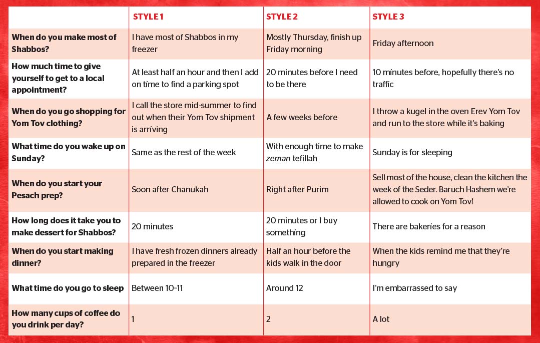 Most of your answers are in column one — you’re super organized. You have a well-run home, but may not appreciate the family members who just don’t get your systems. You yourself don’t need to try any new time-management methods, but experiment with the time-management matches here for family members. Keep up the good work! Make sure you get in some downtime. And if you want others to like you, don’t share with others how early you bentsh licht or start cleaning for Pesach.