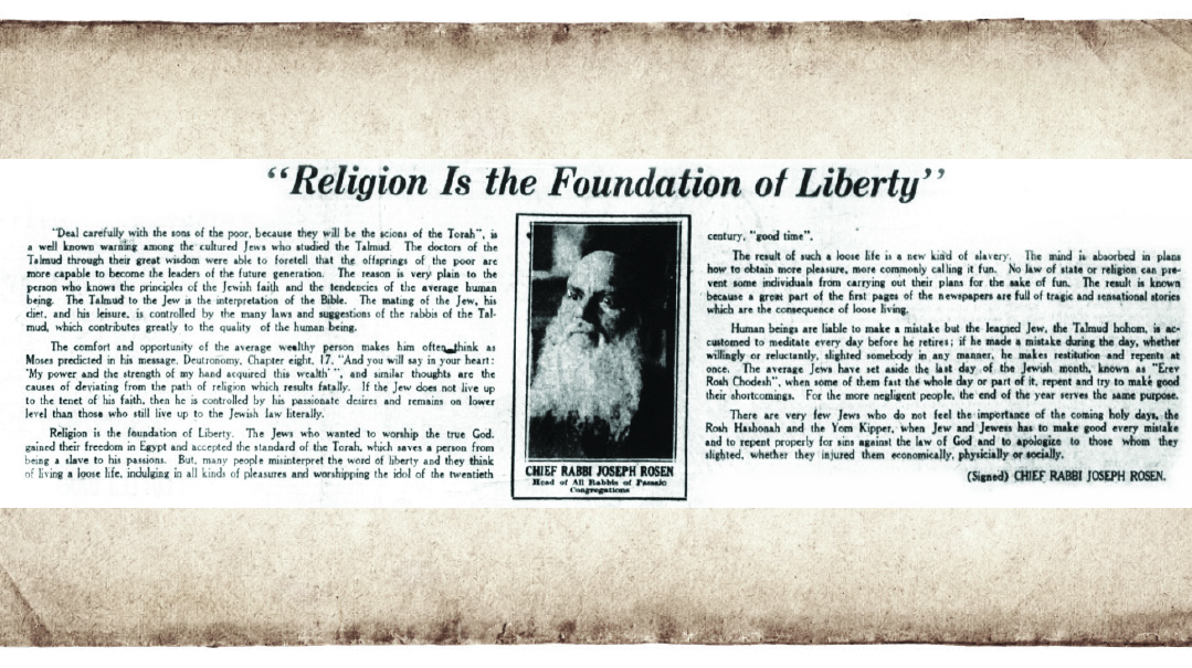 Rav Rosen was a prize talmid of Rav Chaim Leib Tiktinsky in Mir and the Netziv in Volozhin. Following the sudden 1903 petirah of Rav Shneur Zalman Pines (father of Rav Aharon Kotler), Rav Rosen became the rav in Svisloch, Belarus. In 1923, the tall, distinguished-looking Rav Rosen arrived in the United States, where he initially took a position as rav of Shomrei Emunah in Boro Park. Three years later he was offered the position in Passaic, a well-to-do town that benefited from the many worsted mills in the area, several of them owned by immigrant Jews.
