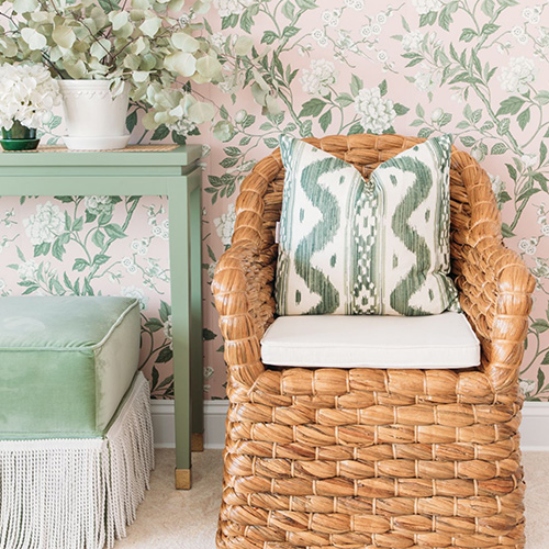 Use classic furniture profiles in trendier patterns: A club chair can feel fresh in a small-scale floral and a fringe skirt.