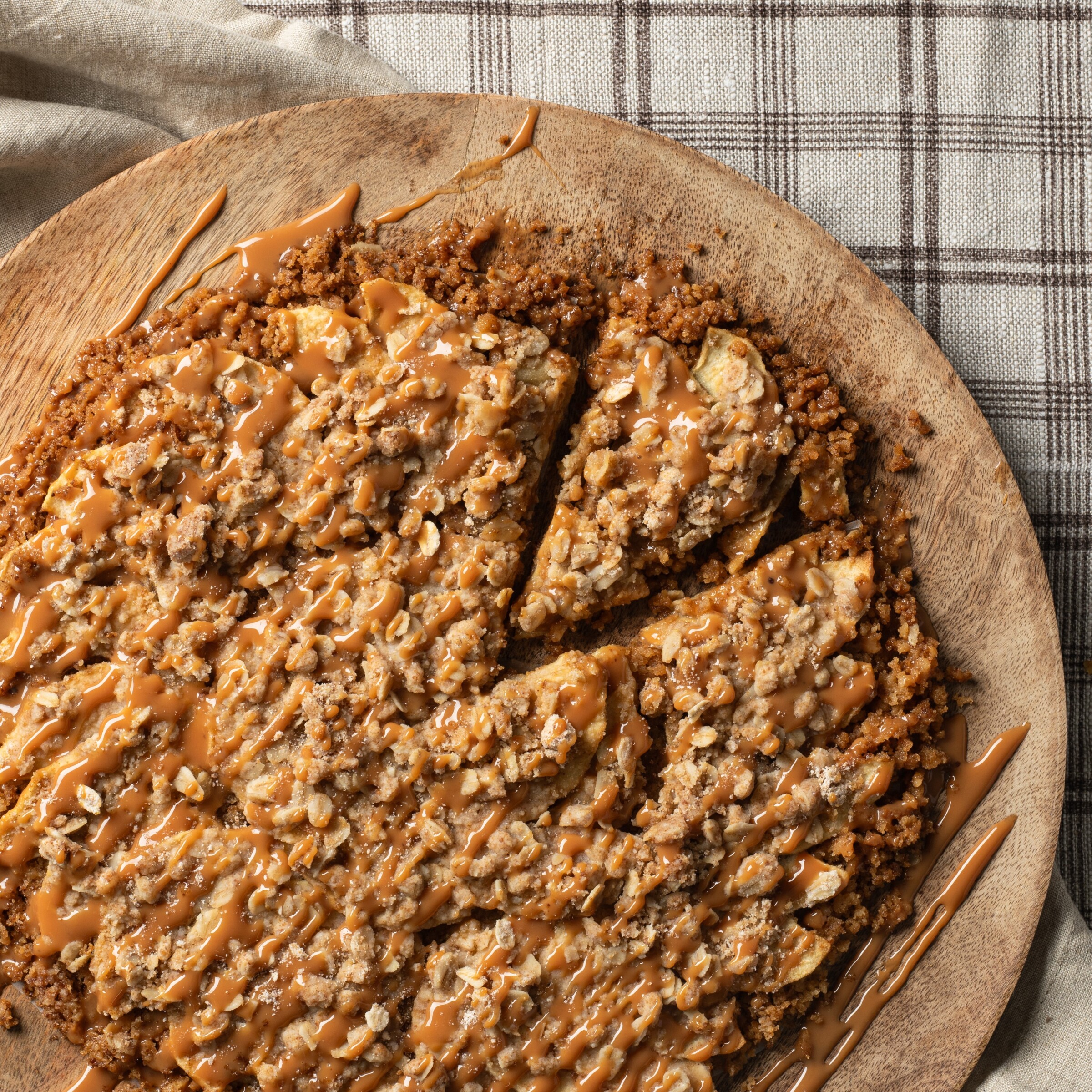 Arrange the apples in a single layer over the cooled cookie crust. Sprinkle the topping evenly over the apples. Drizzle 1–2 Tbsp coconut oil over the top. Bake for