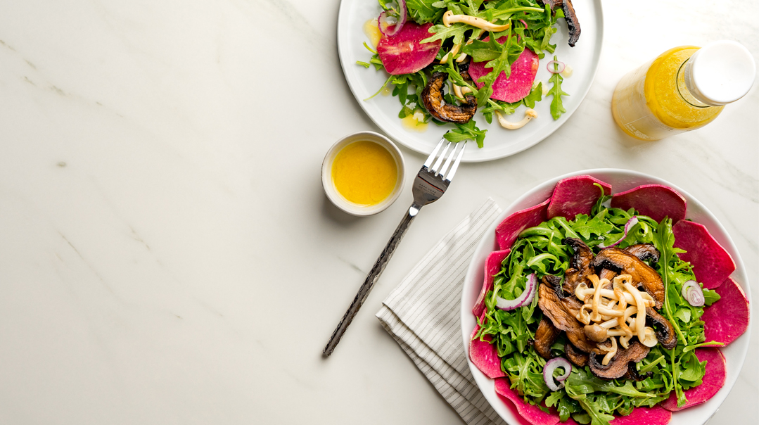 To assemble: Place arugula in a serving bowl. Top with sautéed shiitake mushrooms and thinly sliced onion, if desired. Coat with desired amount of dressing (see note) and toss. Add the rainbow radish slices, arranging around the top of the bowl. Top with dried