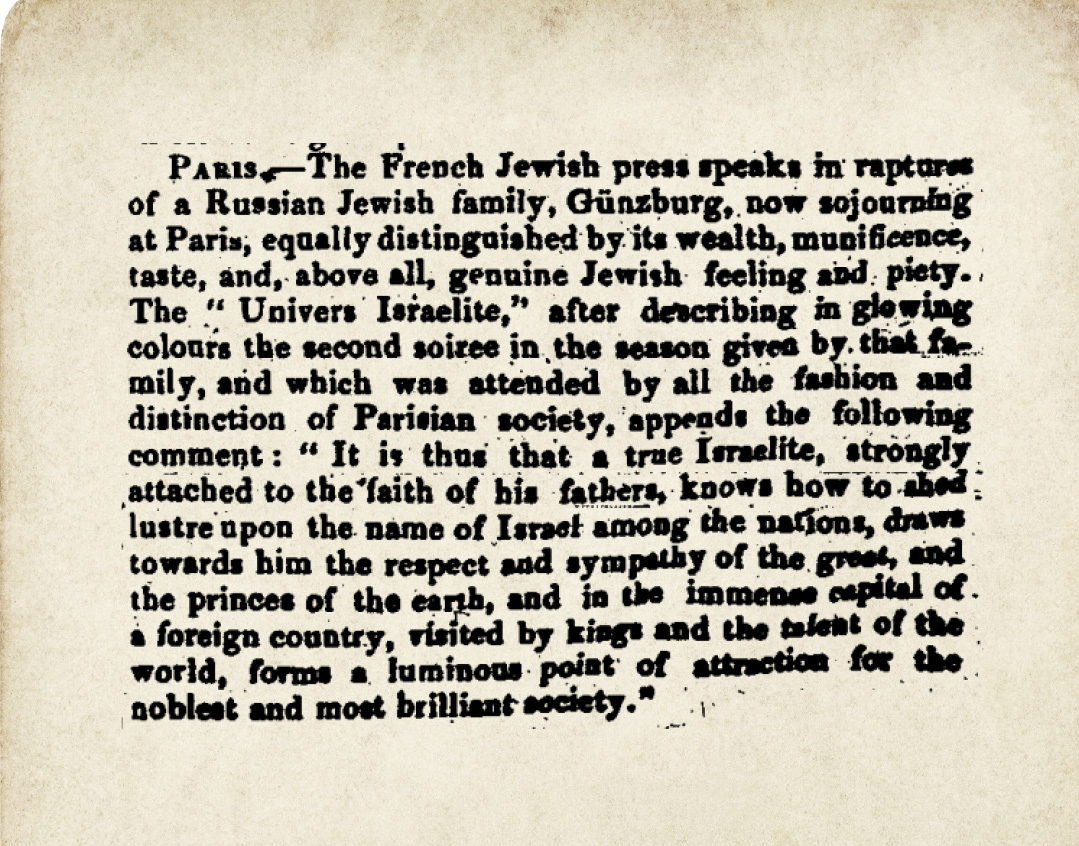 This was true in the realm of philanthropy as well. The generous Gunzburgs supported a wide array of Jewish institutions, religious, social, and educational organizations, with many endeavors across the Jewish spectrum benefiting from their largesse.