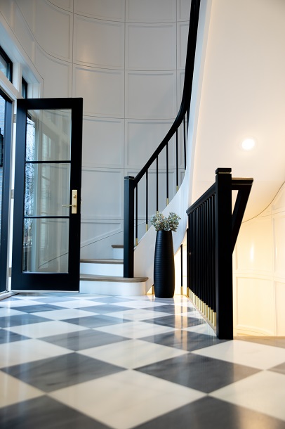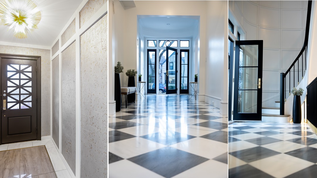 Bigger is not always better! Before you get carried away scrolling through Pinterest-perfect mansions, consider this: large entryways also have their challenges. It can be difficult to make a large entryway feel homey and not cavernous. Tile layout can help; in this case, it can be helpful to define the space with a border or pattern. A large checkerboard pattern with no border can also make a big space feel cozy while still allowing it to be large. Another great option is to add paneling to the walls to give them a warmer feel or to add contrast. In one client’s house where the large open entry and center hall was lacking definition, we kept the walls light, but the doors and windows trimmed in black, in order to help contain the space.