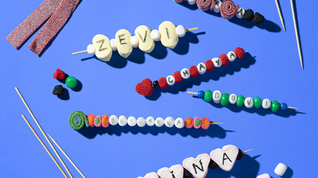 These adorable candy kebabs remind me of friendship bracelets. Here’s where you’d want to have a long name! I made one for my granddaughter Tzipporah. She was pretty disappointed that I decided to write her name in Hebrew…
