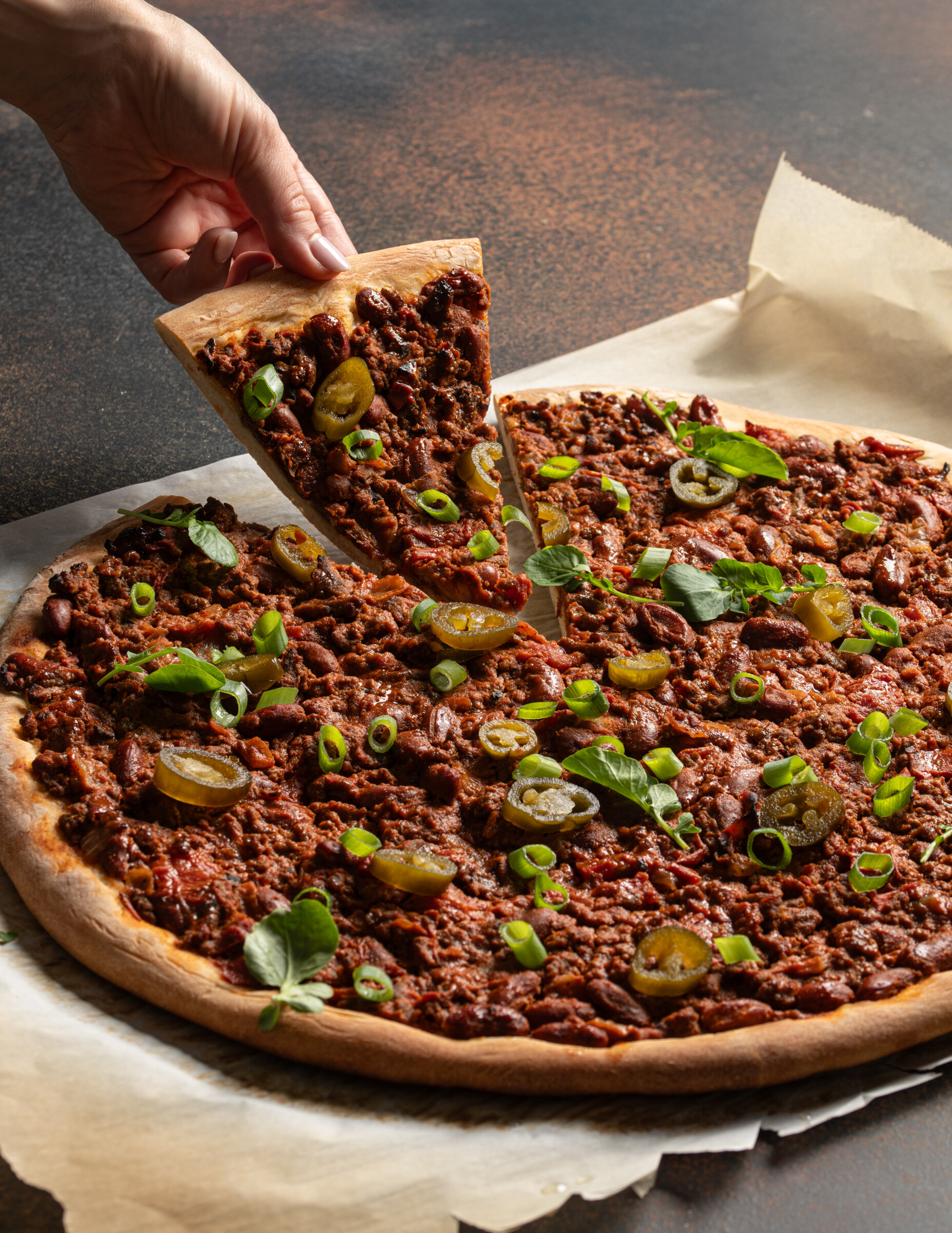 Enjoy this pizza base topped with homemade chili and garnished with candied jalapeños that will make your taste buds do a happy dance.