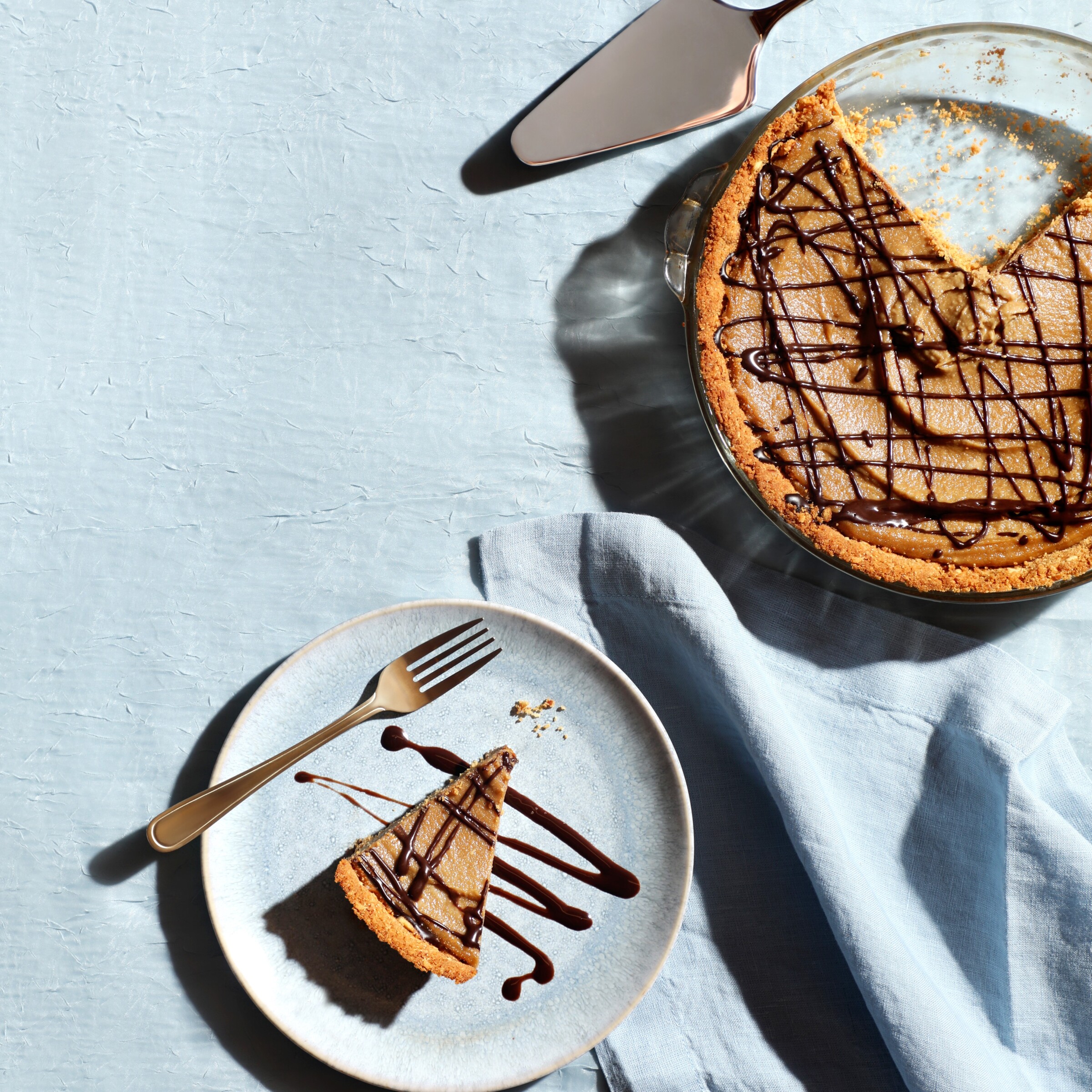 To prepare the fudge, heat the soy milk and chocolate chips in a small saucepan until the chocolate is melted. Add the rest of the ingredients and whisk for 2–3 minutes, until well combined. Remove from heat. Drizzle fudge over ice cream pie.