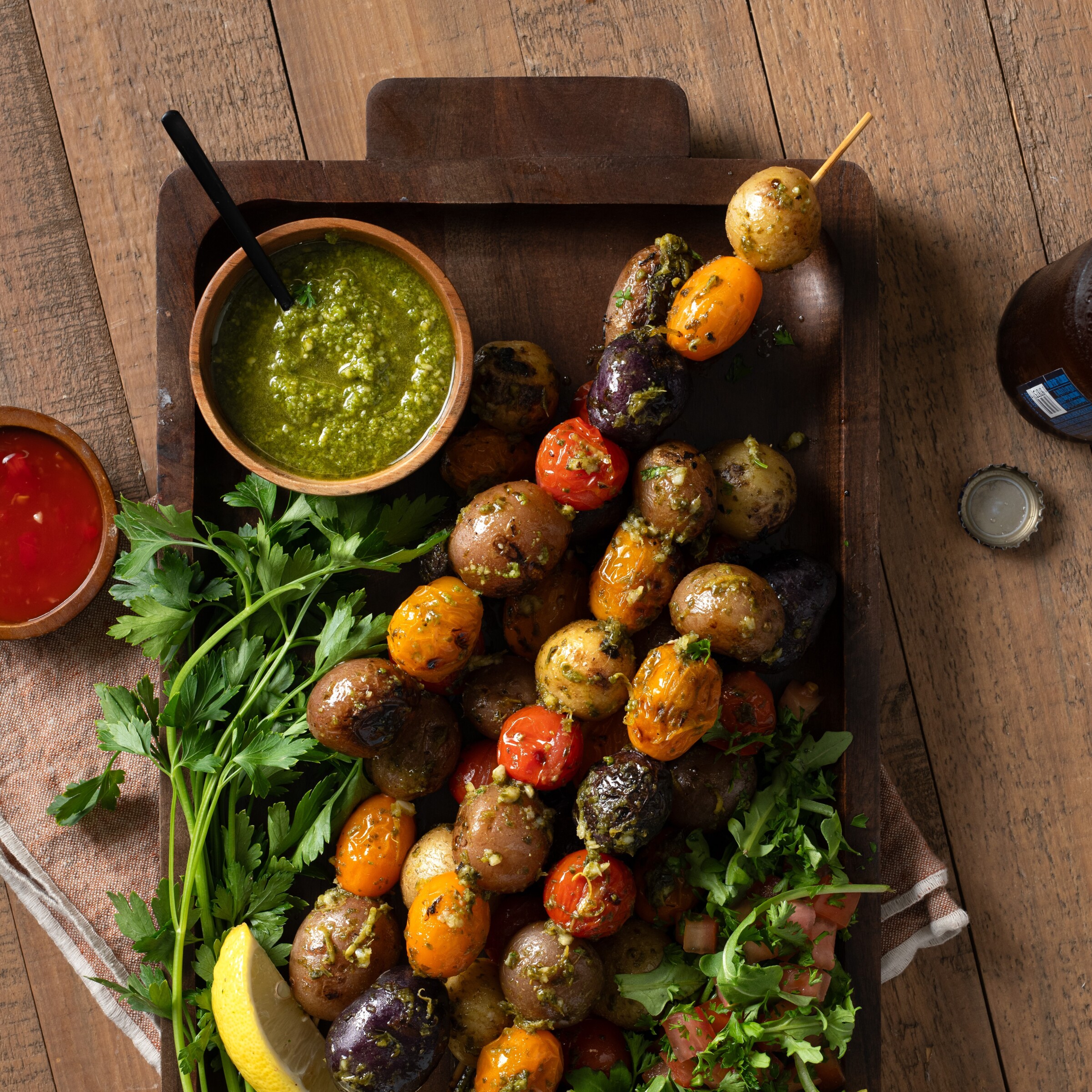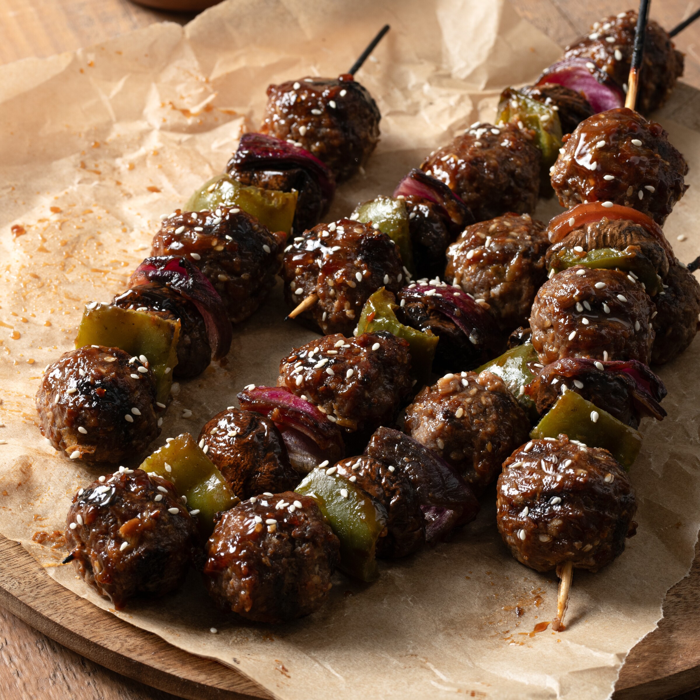 Scallions in meatballs? Yes, yes, yes! Although not such meatball fans in general, while we were taste-testing these skewers, we couldn’t stop munching on these umami flavored meat sticks — they’re that good! Give it a shot and enjoy the explosion of Asian flavoring that’s always such a hit! Yields 16 skewers 1 1/2 lb