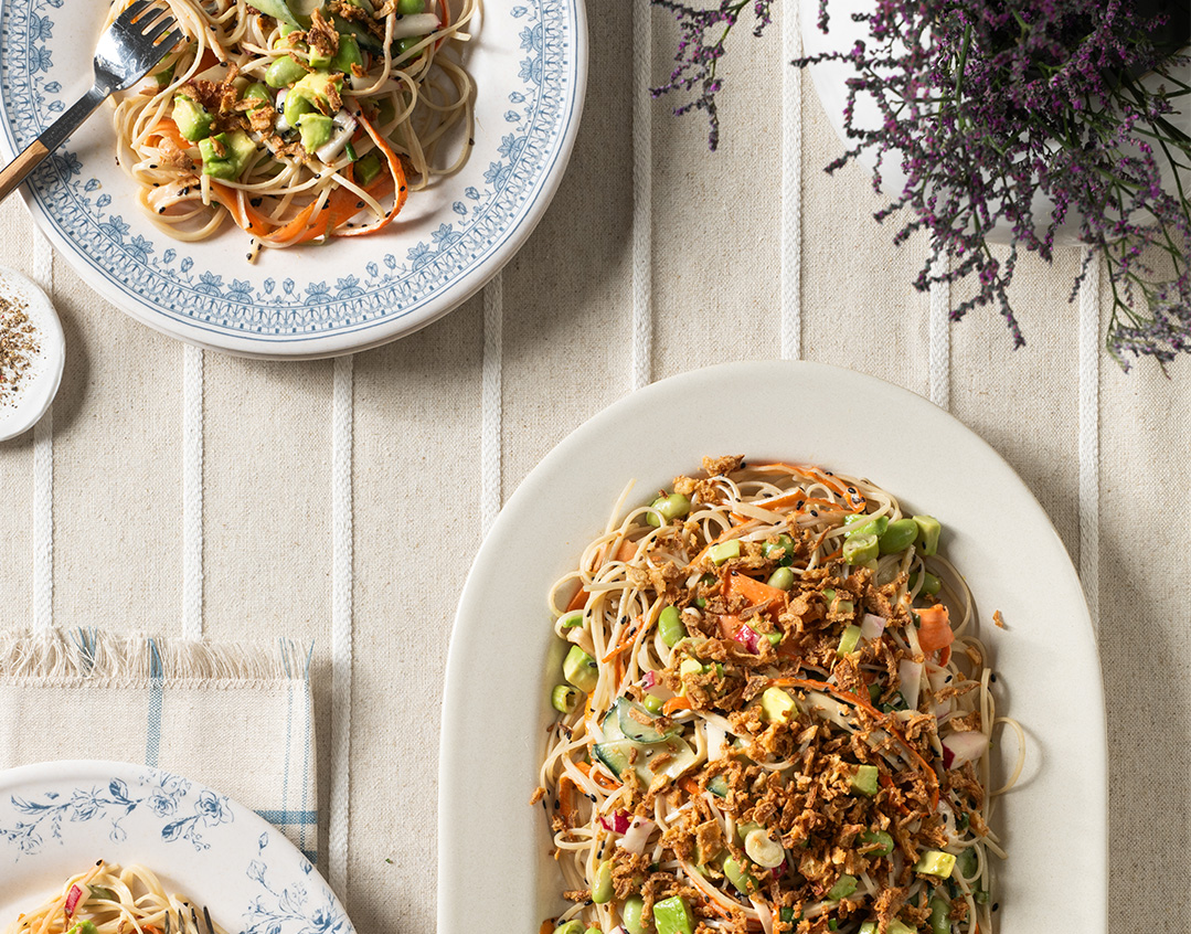 Do you ever want to keep things traditional (think sushi salad, dill salmon, and sesame noodles) but also change it up? We aren’t veering too off course with this kani dish, but the rice noodle base and the wasabi-flavored dressing definitely give your Shalosh Seudos menu a slight upgrade. Easy to prep and even easier