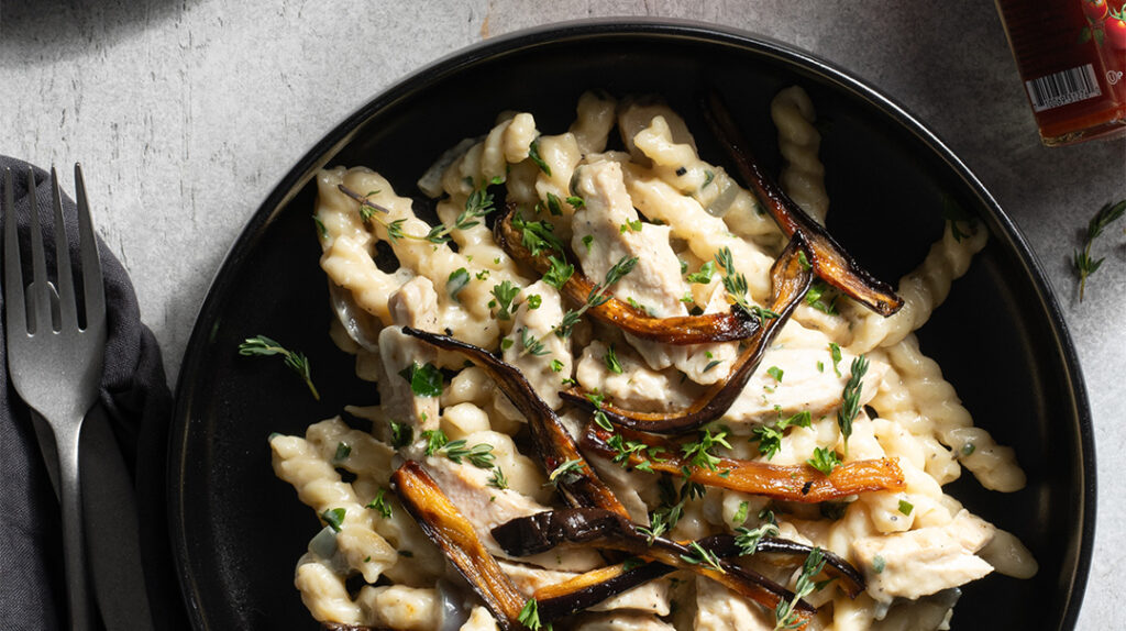Recipes Tuesday, January 28, 2025 Creamy Grilled Chicken and Herb Pasta with Crispy Tomatoey Eggplant