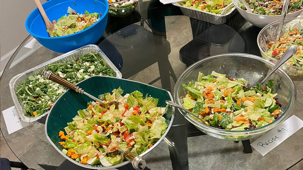 Cooks Compete Tuesday, May 24, 2022 Lettuce Salad with Sweet Potato and Feta Cheese Good lettuce salad with just the right amount of dressing, some feta cheese, and the sweetness of roasted sweet potatoes