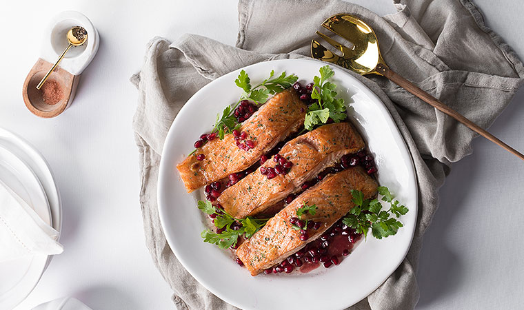 Recipes Wednesday, March 22, 2017 Pomegranate Honey-Glazed Salmon An elegant twist on salmon that presents beautifully and tastes delicious