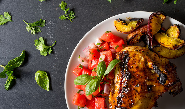 Recipes Wednesday, August 23, 2017 Peach-glazed grilled chicken cutlets with watermelon salad A stunning way to put summer on a plate.
