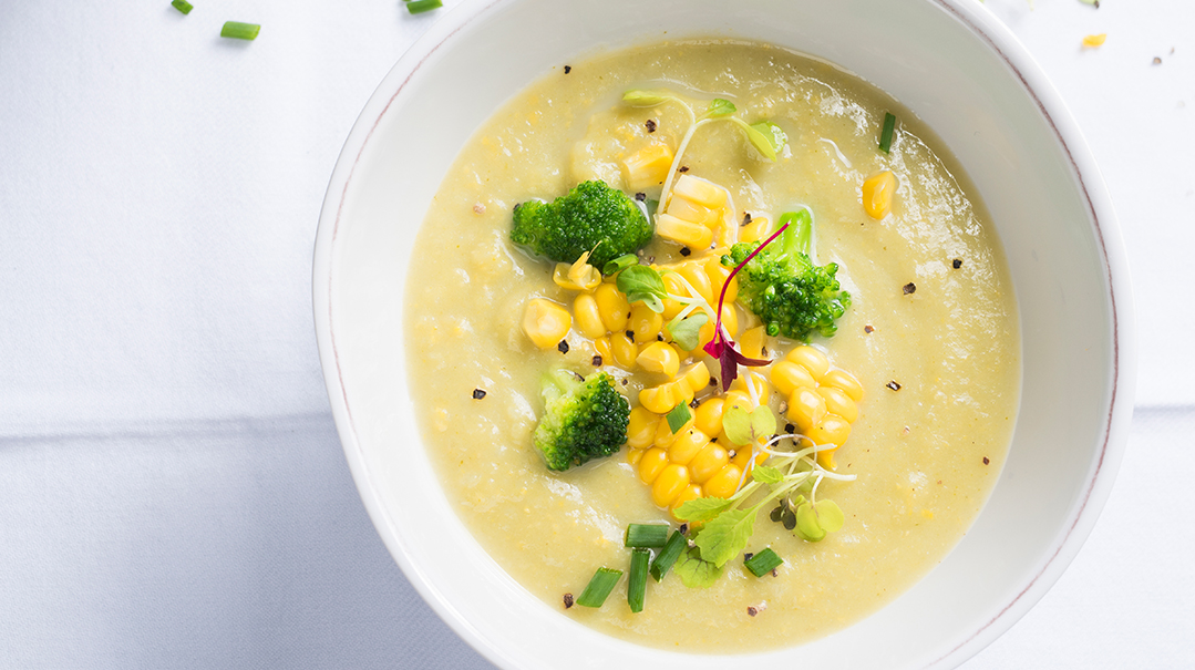 Add milk and blend soup with an immersion blender until smooth and creamy. Add remaining 3/4 cup corn kernels and broccoli florets. Break some of the larger florets into smaller pieces. Bring soup back to a boil and cook for an additional 12–15 minutes, or until broccoli begins to soften. Season with freshly ground black pepper.