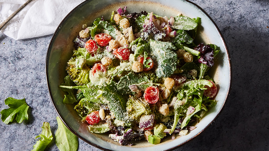 Sprinkle warm gnocchi with Parmesan cheese and additional salt, garlic powder, and onion powder, tossing well to coat. Add the roasted broccoli and crispy gnocchi to the salad, drizzle with some of the dressing, and toss well to combine. Serve immediately.