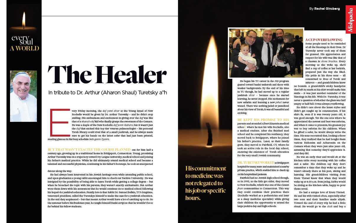 very Friday morning, the daf yomi shiur at the Young Israel of New Rochelle would be given by Dr. Arthur Turetsky – and he didn’t stop smiling. His enthusiasm and excitement in giving over the daf was like that of a shanah alef kid who finally grasps the sweetness of the Gemara. He was a staple of the New Rochelle daf yomi chabura, but it wasn’t just the daf that excited this top-tier veteran pulmonologist – his personal Torah library could rival that of a small yeshivah, and he always made sure to get his hands on the latest sefer that had just been printed, stealing glances in his busy schedule bein gavra l’gavra.