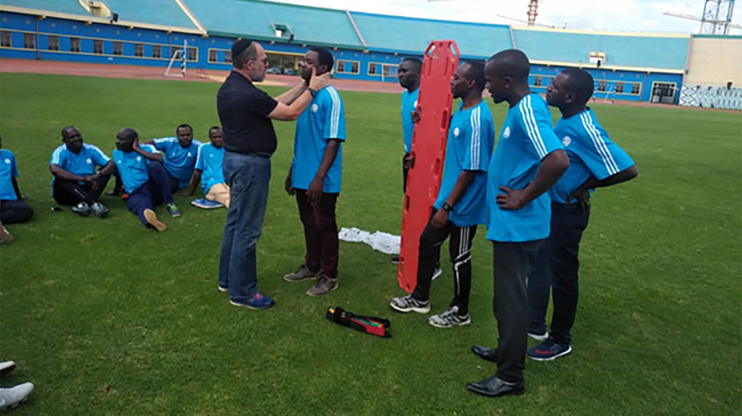 Teaching football emergency medicine in Kigali, Rwanda. Disaster medicine is his specialty, but emergency sports medicine is his passion