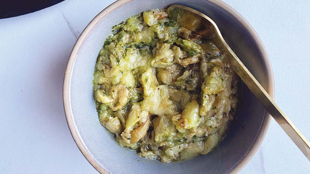 Place the eggplant on a baking sheet lined with parchment paper. Sprinkle with spices, then drizzle generously with olive oil. Roast at 400°F (200°C) for 30–40 minutes. When done, remove the flesh from the centers of the rounds and transfer to a bowl. Add parsley cubes and any additional seasoning to taste. I like it without mayo, but if you prefer a creamier dip, you can add mayo at this point.
