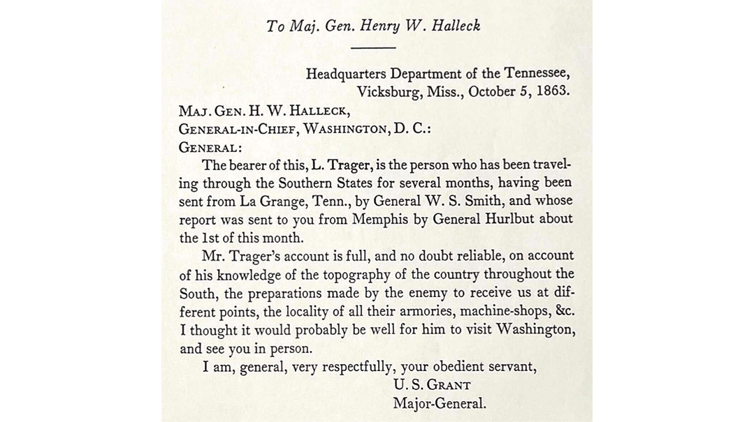In 1890, his report was published in the Official Records of the Union and Confederate Armies, and it’s from there that can glean how seriously General Ulysses S. Grant took the 20-year-old Trager’s findings. He gave Trager a personal letter of introduction to General Henry Halleck, the commanding general of the Union army, in which he wrote: