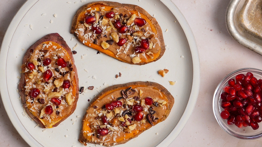 Allow to cool. To serve, spread with almond butter, then sprinkle with pomegranate seeds, coconut flakes, cacao nibs, and crushed walnuts for a delicious, filling macro meal.