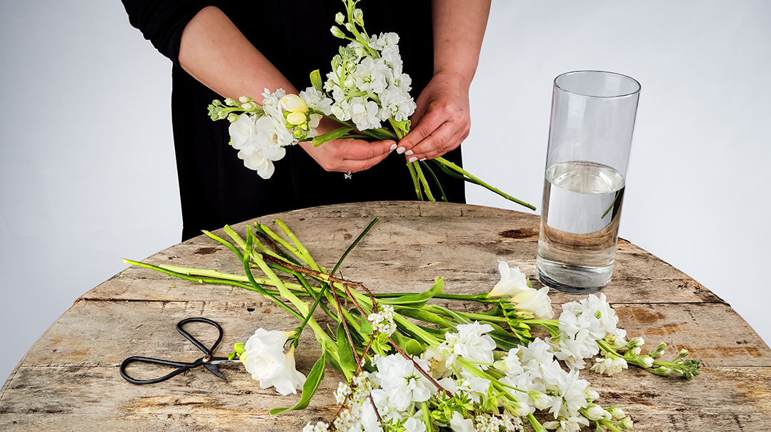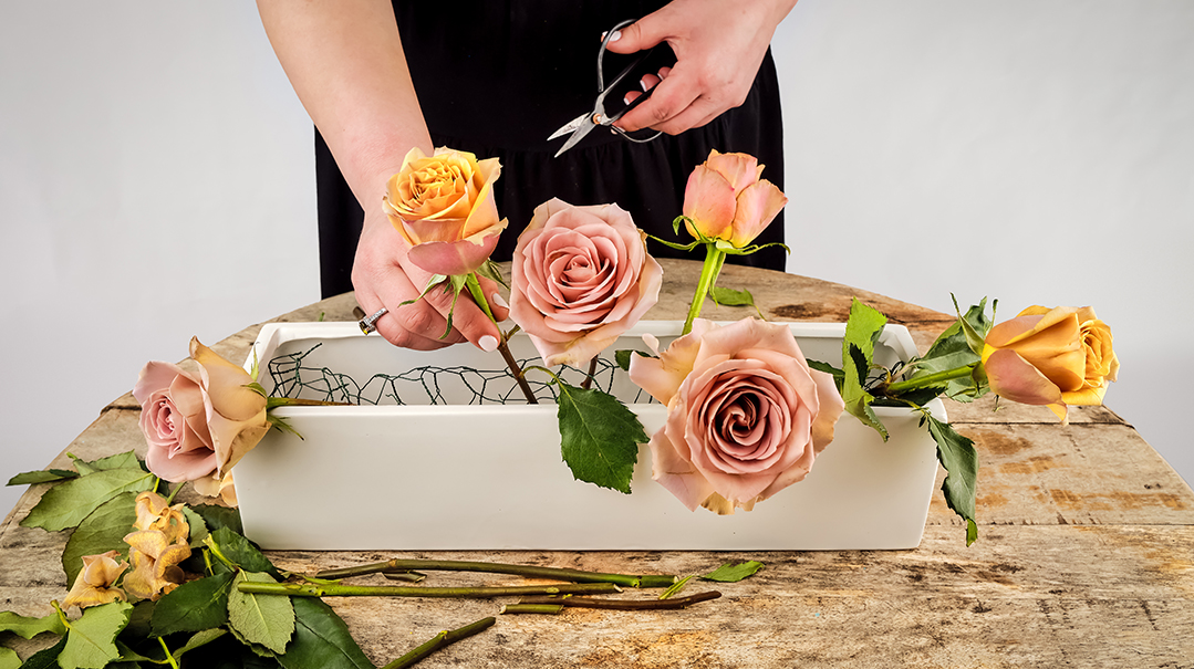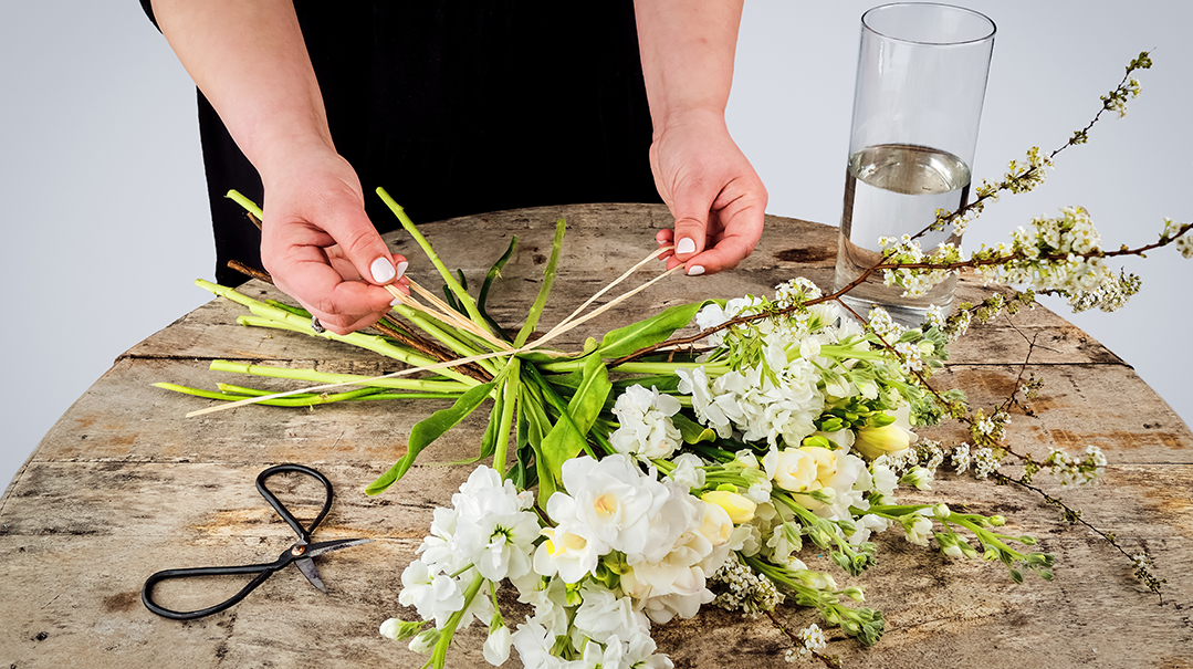 - Remove all the packaging from your flowers. Lay the stems parallel on your counter or table.