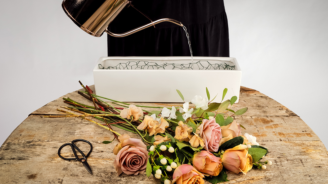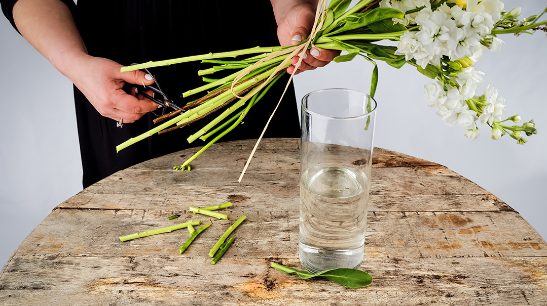 - Make sure your vase is clean! Soap and hot water will do the trick. After washing, fill the vase with room-temperature water. If you have flower food, be sure to add a sprinkle (not the whole package). If you don’t have flower food, you can add a tiny drop of bleach, but not too much!