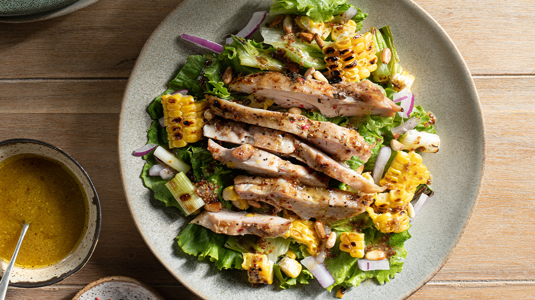To assemble salad: Cut chicken into strips. Slice corn off the cob. Cut scallions into 1-inch (2-cm) pieces. Combine chicken, corn, and scallions with lettuce and red onion. Combine dressing ingredients and pour over salad.