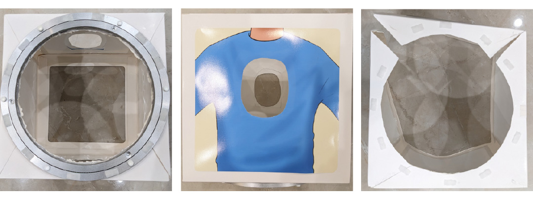 Using a utility knife or scissors, cut holes slightly bigger than the faces of the illustrations on each of the four sides of the box.