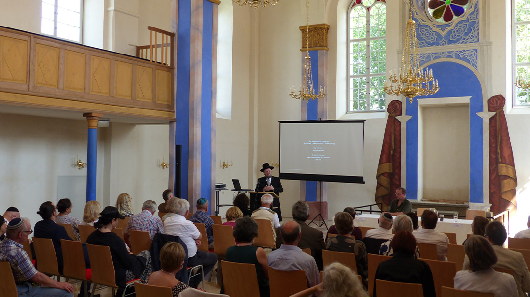 He explained, for example, that although the shul was rebuilt with incredible detail, there is one gaping “hole” in the reconstruction: The panels on either side of the area where the aron kodesh should stand are painted a deep, sky blue, but where the aron itself should be, there is nothing. That, he said, is because the shul is to be used for Jewish educational and cultural events, and a heichal with an aron kodesh may only be used for tefillah and learning.