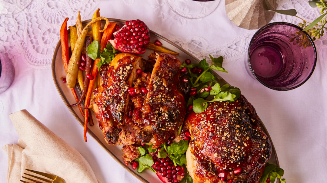 Place into the oven, uncovered, and roast for 25 minutes. Remove pan from oven and spoon some additional glaze over the top of each hen. Sprinkle generously with Everything spice and return to oven for an additional 50 minutes. Allow to rest several minutes before slicing.