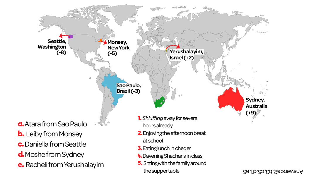It’s five o’clock in London, and Brachie and her sisters are relaxing with some biscuits before starting their homework. They’re wondering what kids all around the world are doing right now. See if you can match the kid and location to the appropriate activity, based on the map below that tells you how many hours ahead or behind London those places are.