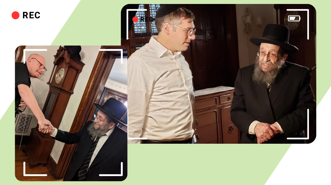 Senior Production Manager Moshe Niehaus interviewing Rav Elya Brudny in Passaic for Adirei HaTorah