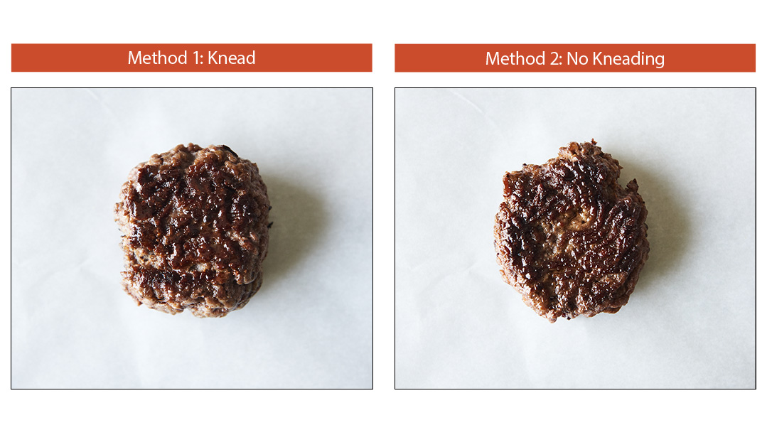 But what about kneading the meat? The refrain I constantly hear and read about implores us not to knead, but I wonder if that’s valid. After all, I love nicely shaped, uniform patties. Let’s experiment!