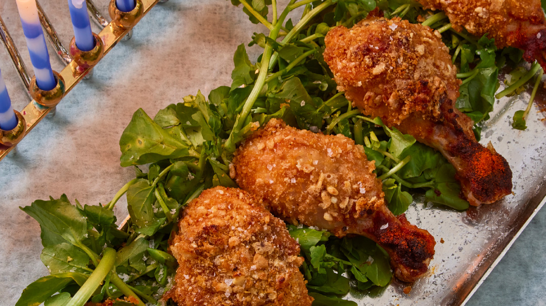 My mother gets the credit for these candle-themed drumsticks; she suggested dipping the ends into paprika to achieve a flame effect, and it worked better than I imagined! If your family prefers its dinner a bit milder, just mix the spicy mayo with regular mayonnaise, and you should be good to go. Either way, this chicken is moist, tasty, a cinch to make, and fun to eat on a Chanukah evening!