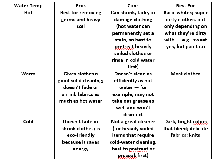 Just like in baking, temperature in laundering can dramatically change the finished product. To keep all my newfound knowledge straight, I created a chart and pasted it next to my washing machine: