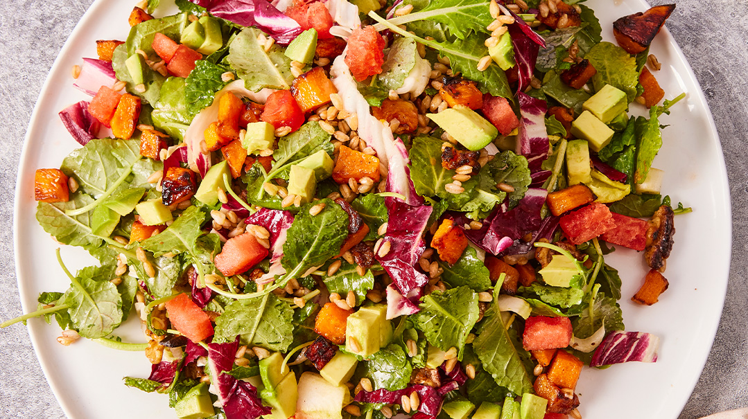 Toss squash in oil and spread onto a lined baking sheet. Roast for 30 minutes; broil on lower rack an additional 5–8 minutes until beginning to brown at the edges. Remove from oven and allow to cool. Combine kasha, lettuce, avocado, watermelon, mint, and parsley in a large serving bowl.