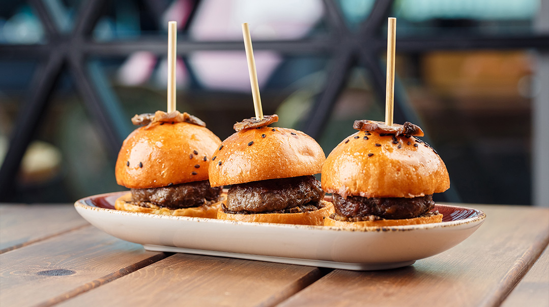 Frozen mini burgers dressed up with sautéed mushrooms and onions.