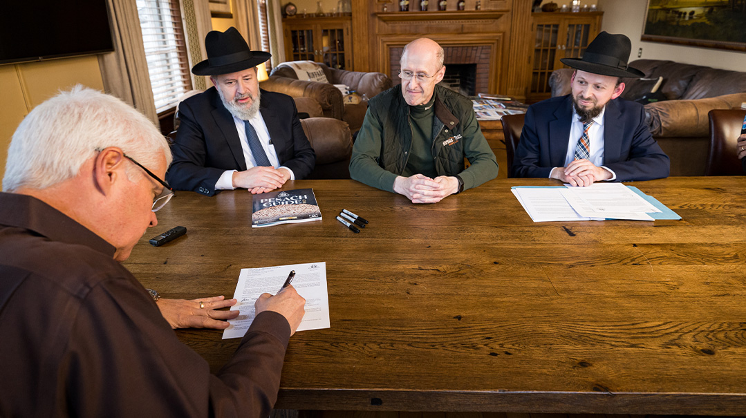Drew (left) is signing to give official permission on behalf of the company for Rabbi Fishbane to serve on behalf of the owners to sell their chometz, while Mark (who will purchase the chometz) and Rabbi Neihaus look on. Mark even did a DNA test to make sure he wasn’t Jewish