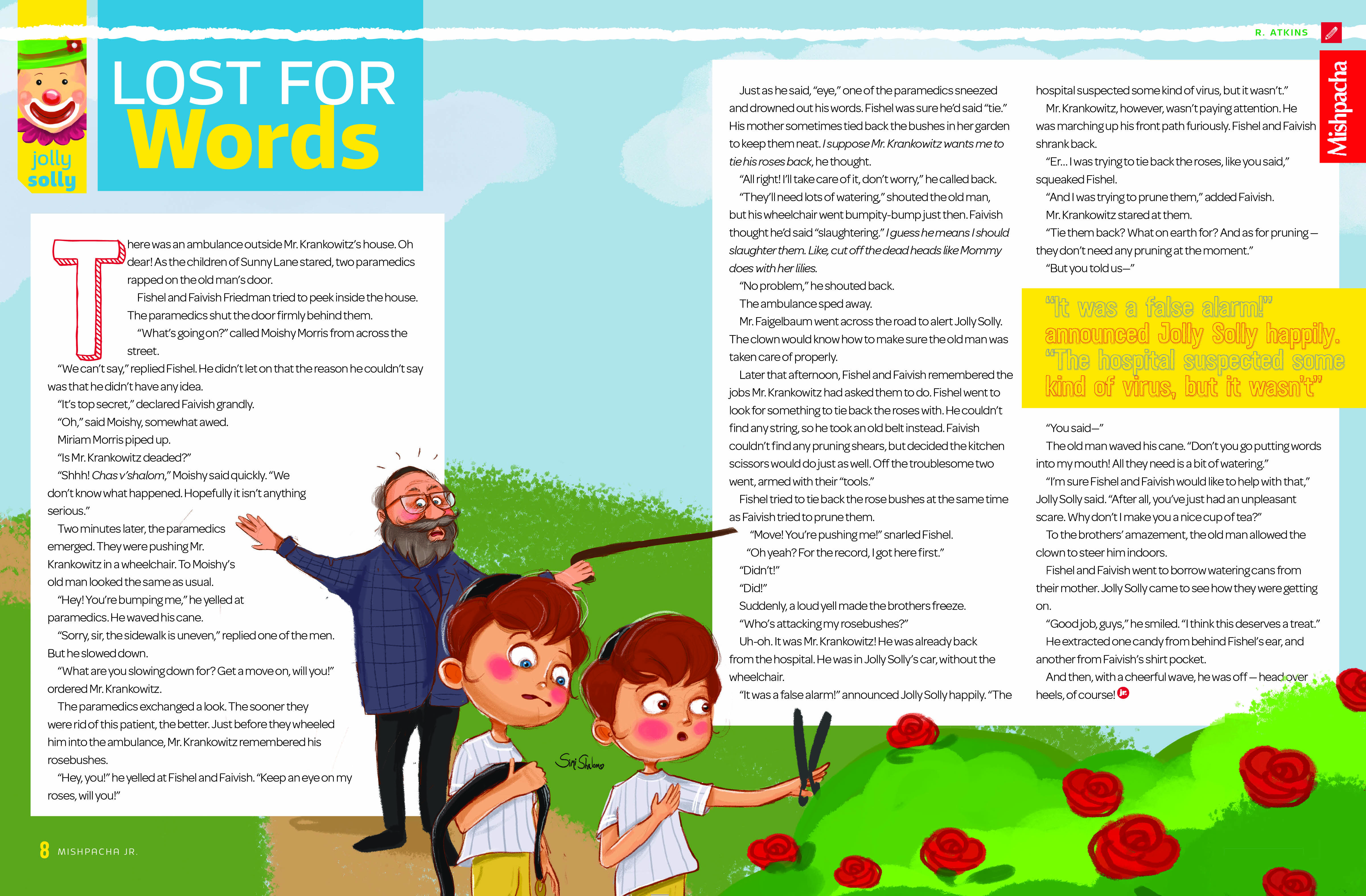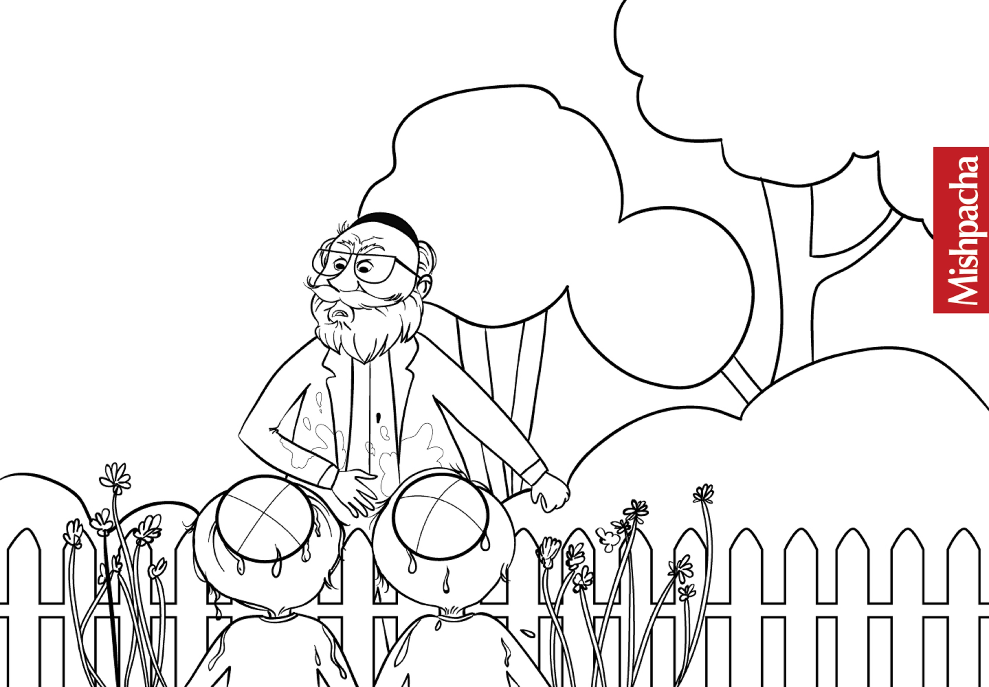 Later that afternoon, Fishel and Faivish remembered the jobs Mr. Krankowitz had asked them to do. Fishel went to look for something to tie back the roses with. He couldn’t find any string, so he took an old belt instead. Faivish couldn’t find any pruning shears, but decided the kitchen scissors would do just as well. Off the troublesome two went, armed with their “tools.”