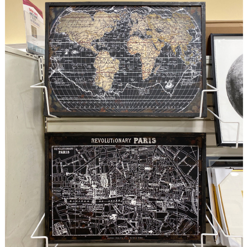 This captivating world map would look great in a boy's room, playing into a child's curiosity, but with timeless style. Leave the bottom one because it says “Revolutionary Paris,” and I’m not so keen on having connotations of war in a bedroom.