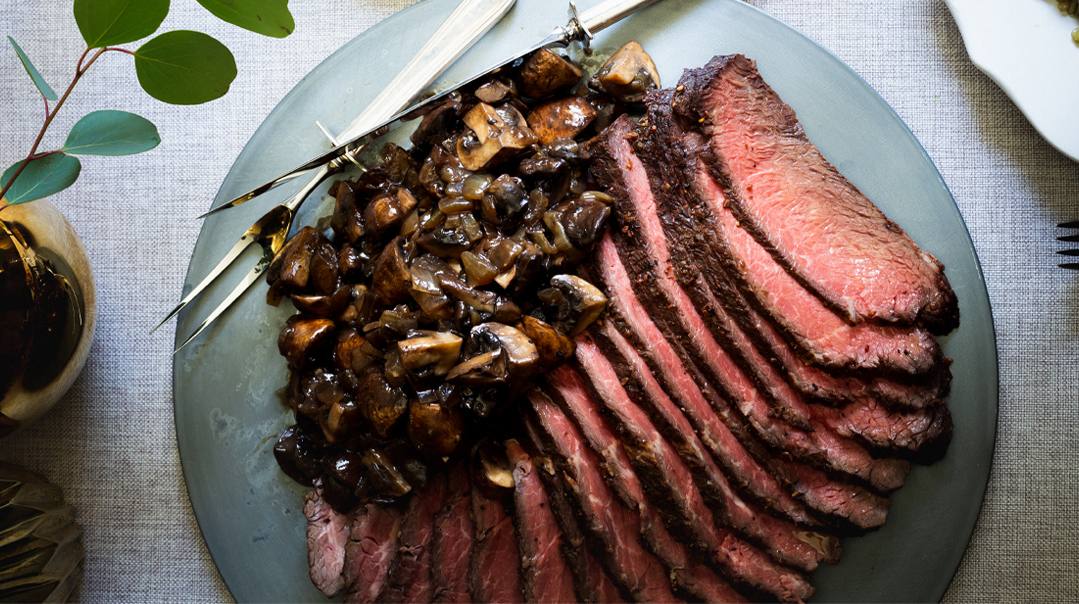 Remove meat from oven, and loosely tent with foil to rest for 25–30 minutes before slicing. This will allow the meat temperature to rise another five degrees to the perfect doneness. Transfer the meat to a cutting board when it’s finished resting and slice against the grain. To make the gravy: While the meat is resting, place diced onion in a medium saucepan and sautי in oil until brown and caramelized. Add mushrooms and continue cooking until soft. Once you’ve transferred the meat to the cutting board, deglaze the baking pan with red wine and warm water. Pour the meat drippings into the mushroom and onions, scraping all the little browned bits into the sauce, to impart lots of meaty flavor. Add thyme and cornstarch slurry and bring to a low boil, stirring until slightly thickened. Spoon gravy over meat and serve immediately.
