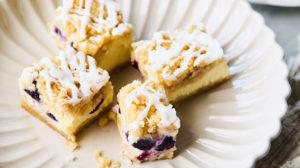 Buttery crumbs blanket a cheesecake dotted with blueberries and glazed with a hint of lemon… Need I say more?