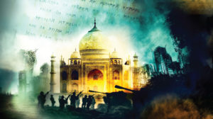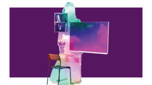 Her blonde hair is cut short and kind of jagged, and she’s wearing a graphic tee with sleeves just grazing the elbows, a short black skirt, and black leggings.
