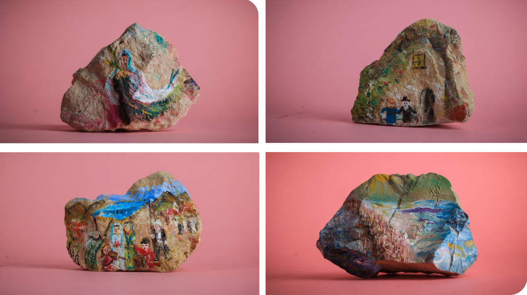 In the spare bedroom, there are rows of rocks lining the desk, each with a tiny, meticulously painted picture on them. They’re magnificent and charming at the same time. There’s Kri’as Yam Suf the walls of water in various shades of blue and green, tiny people in robes and shawls, some holding canes, passing through. Then there’s the sweetest painting of an elderly couple sitting on a bench next to an arched doorway, beneath a canopy of flowers and those small barred windows typically found in the Old City. They remind me of the pasuk, “Od yeshvu zekeinim v’zekeinos birchovos Yerushalayim.”