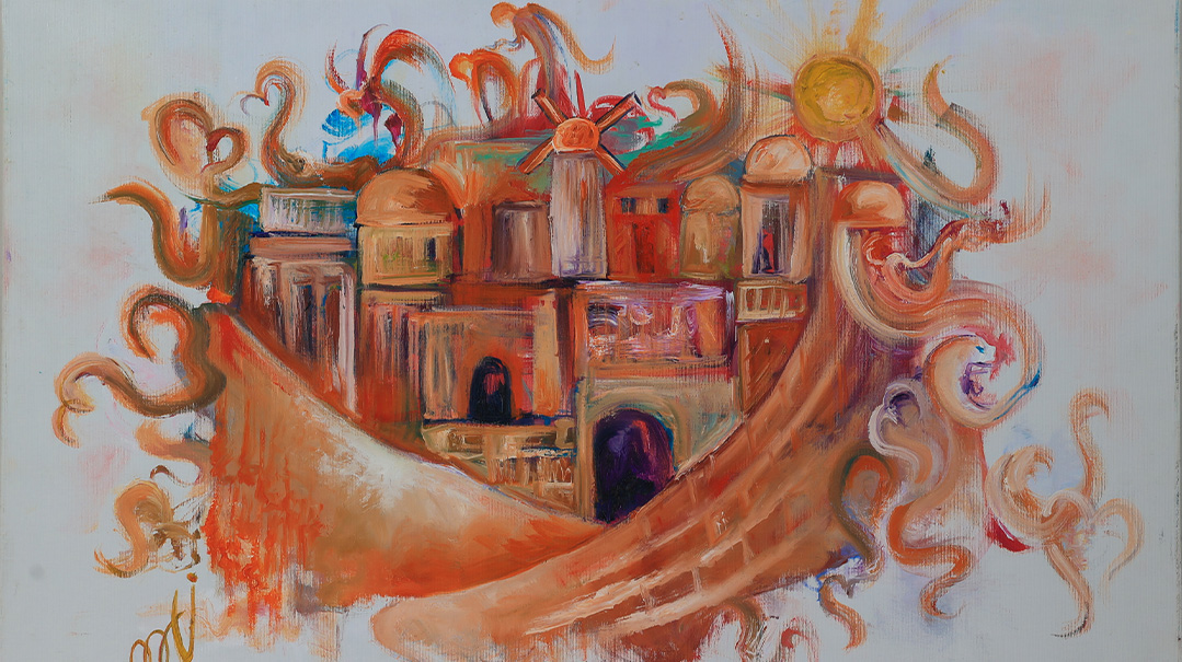 There’s one painting that’s unusually arresting. Done entirely in orange and yellow, Matti painted it on honor of one of her wedding anniversaries. At the top of the painting is a young bearded violinist, his head resting on his instrument, the reverence and concentration he’s playing with captured on his face. Underneath him are a Yerushalmi chassan and kallah in the midst of a mitzvah tanz, hands clasped. Looking at the picture, you can sense the holiness of the moment. The couple appears to be standing atop one of the stone walls of the Old City, Migdal David in the background. A border of small Yerushalmi stones completes the picture.