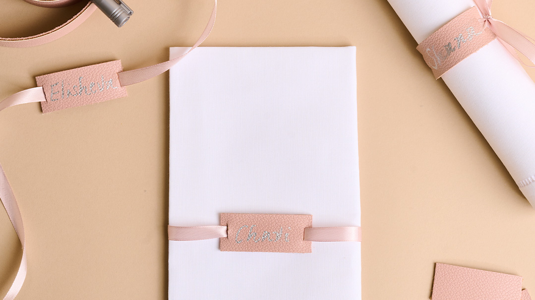 Once the name tags are ready, either place the ribbon behind a folded napkin or tie a bow around a rolled-up napkin.