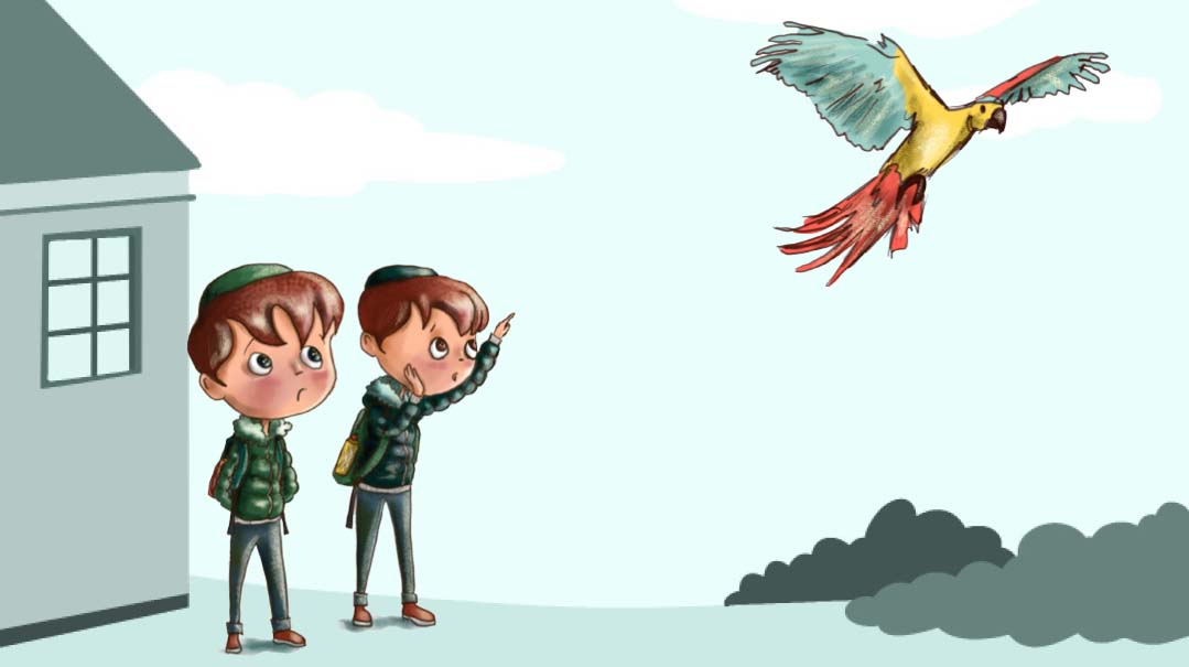 They were so busy fighting, that they heard nothing of the goings-on outside. Jolly Solly came out of his house, with Tuki on his shoulder. He was surprised to see the parrot he’d left with the Rabinowitzes up a tree. This parrot wasn’t Tuki. It was staying with the Rabinowitzes because Jolly Solly’s mother did not like the noise from two screeching parrots. Jolly Solly quickly got the parrot back into its cage, and latched it firmly closed.