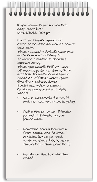 “Later” turns out to be a conference call, right in the middle of her study session with Kayla. Vacation, apparently, is not a good enough reason to skip their nightly review, although Mimi’s already decided that this is going to be her last night of schoolwork until the end of vacation. She needs the break.